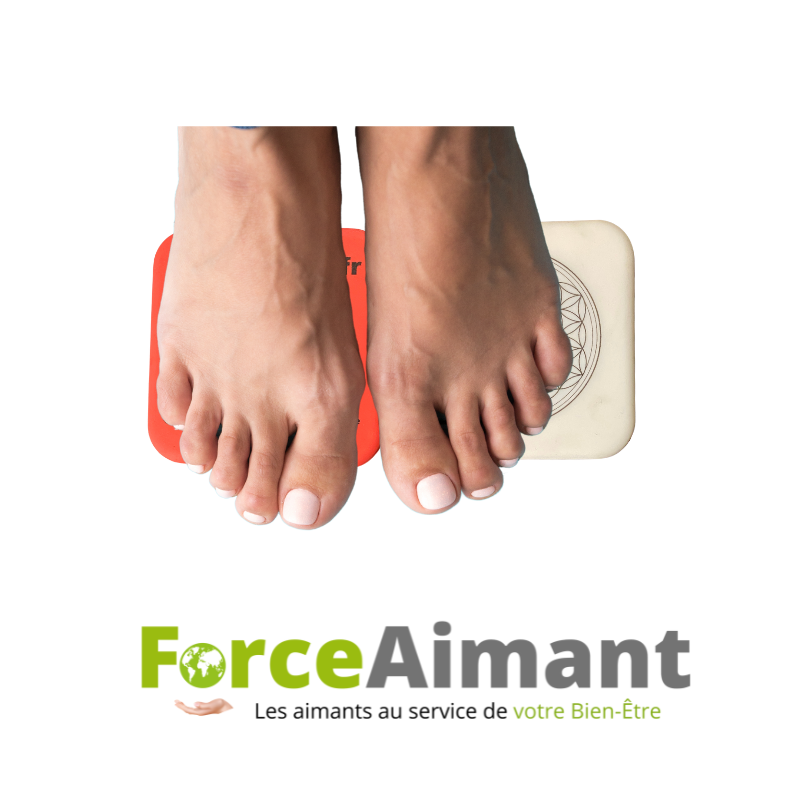 Pour rééquilibrer la partie inférieure du corps utilisez les pieds en posant le pied droit sur la face Nord d’un magnet et le pied gauche sur la face Sud de l’autre magnet.