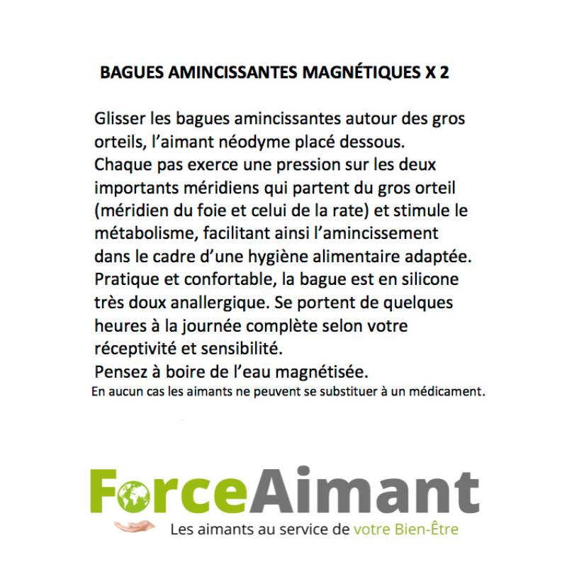 Les aimants positionnés sous le gros orteil, juste au niveau d’un point connu en acupuncture comme le point de départ de plusieurs méridiens. Le magnétisme des bagues amincissantes peut agir sur le stress, sur l’équilibre physique, sur la circulation sanguine, et sur l’énergie vitale. Elle occasionne par la suite la baisse de l’appétit, de façon normale et sûre.