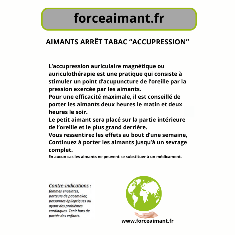 3 paires d’aimants de tailles différentes sous forme de pastilles dans une pochette. Les aimants stimulent la production des endorphines qui éliminent le désir de fumer.