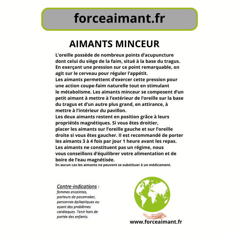 On utilise deux paires aimants que vous placez recto verso sur le tragus de l’oreille gauche si vous êtes droitier, et inversement si vous êtes gaucher, la pression sur ce point précis est réputée réduire sensiblement la sensation de faim et l’appétit.