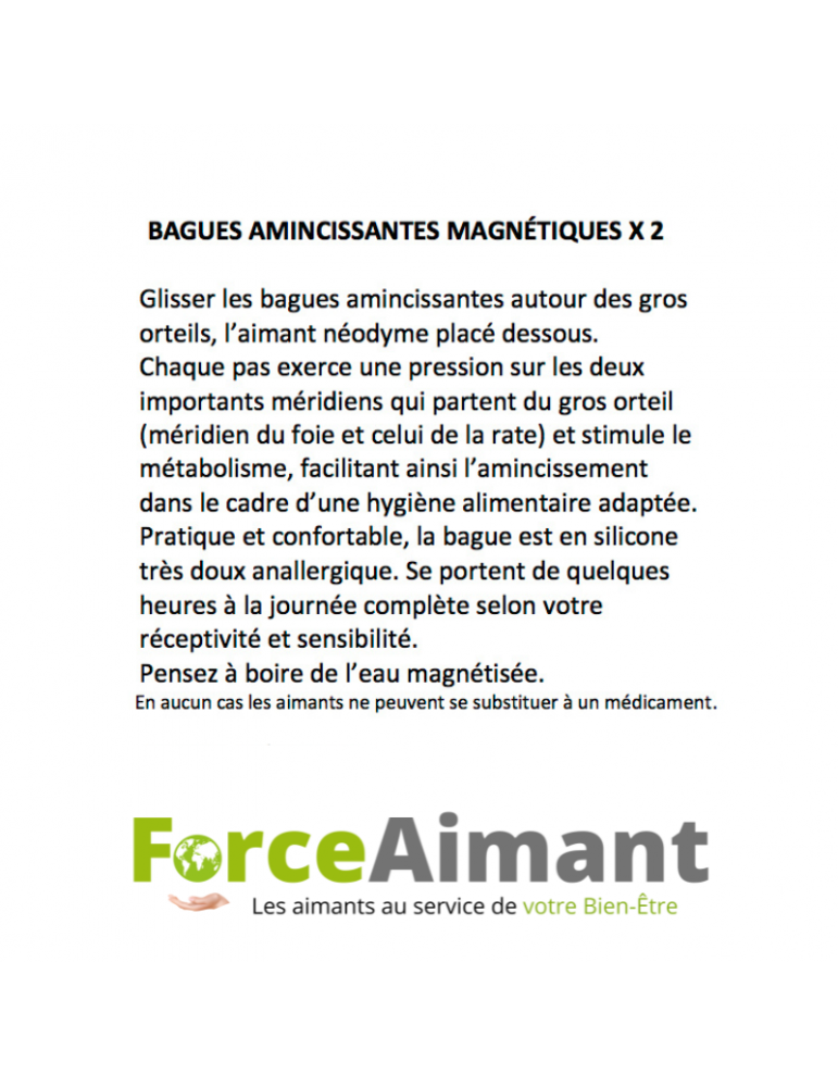 Les aimants positionnés sous le gros orteil, juste au niveau d’un point connu en acupuncture comme le point de départ de plusieurs méridiens. Le magnétisme des bagues amincissantes peut agir sur le stress, sur l’équilibre physique, sur la circulation sanguine, et sur l’énergie vitale. Elle occasionne par la suite la baisse de l’appétit, de façon normale et sûre.