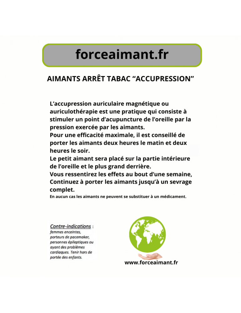 3 paires d'aimants de tailles différentes sous forme de pastilles dans une pochette. Les aimants stimulent la production des endorphines qui éliminent le désir de fumer.