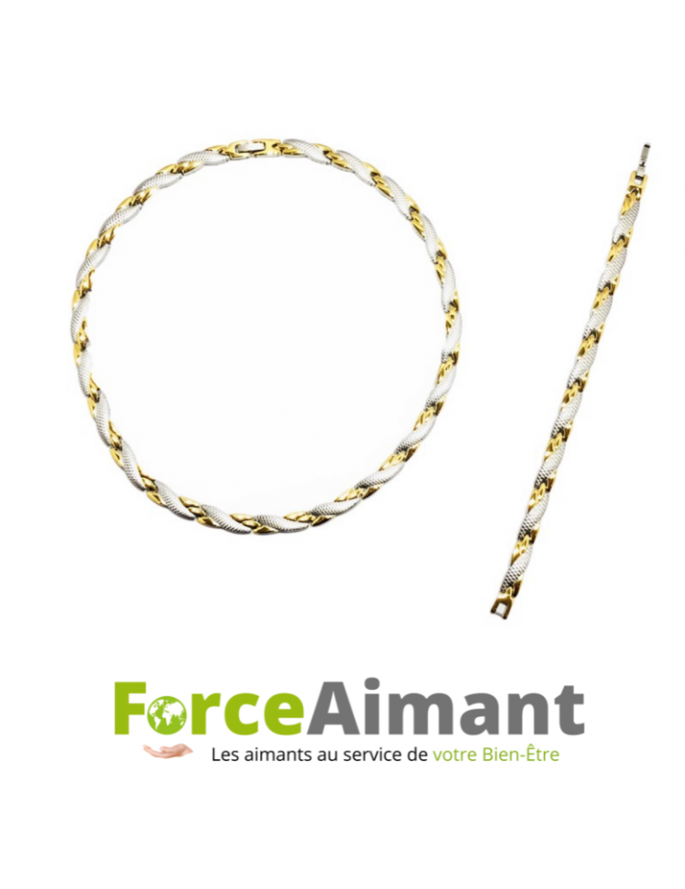 Cette magnifique parure magnétique est très élégante, elle favorise la sérénité, le bien-être et elle pourra agir sur les tensions grâce à ses 42 aimants pour le collier et 16 aimants pour le bracelet.