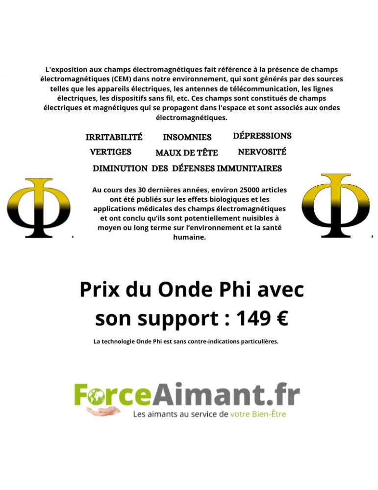 Grâce à de faibles champs magnétiques qui interagissent dans toutes les cellules des systèmes biologiques, cette communication cellulaire naturelle est affecté par des interférences. la technologie spéciale de l'Onde Phi est formée par une antenne, un télécharger et bobine qui absorbent tous les champs artificiels et naturels et les convertit en chaleur inoffensive. Durant l'élimination de communications cellulaires il se produit une interférence qui libère les cellules de ce stress de sorte à ce qu'elles travaillent uniquement à produire de nouvelles cellules et les renforcer.